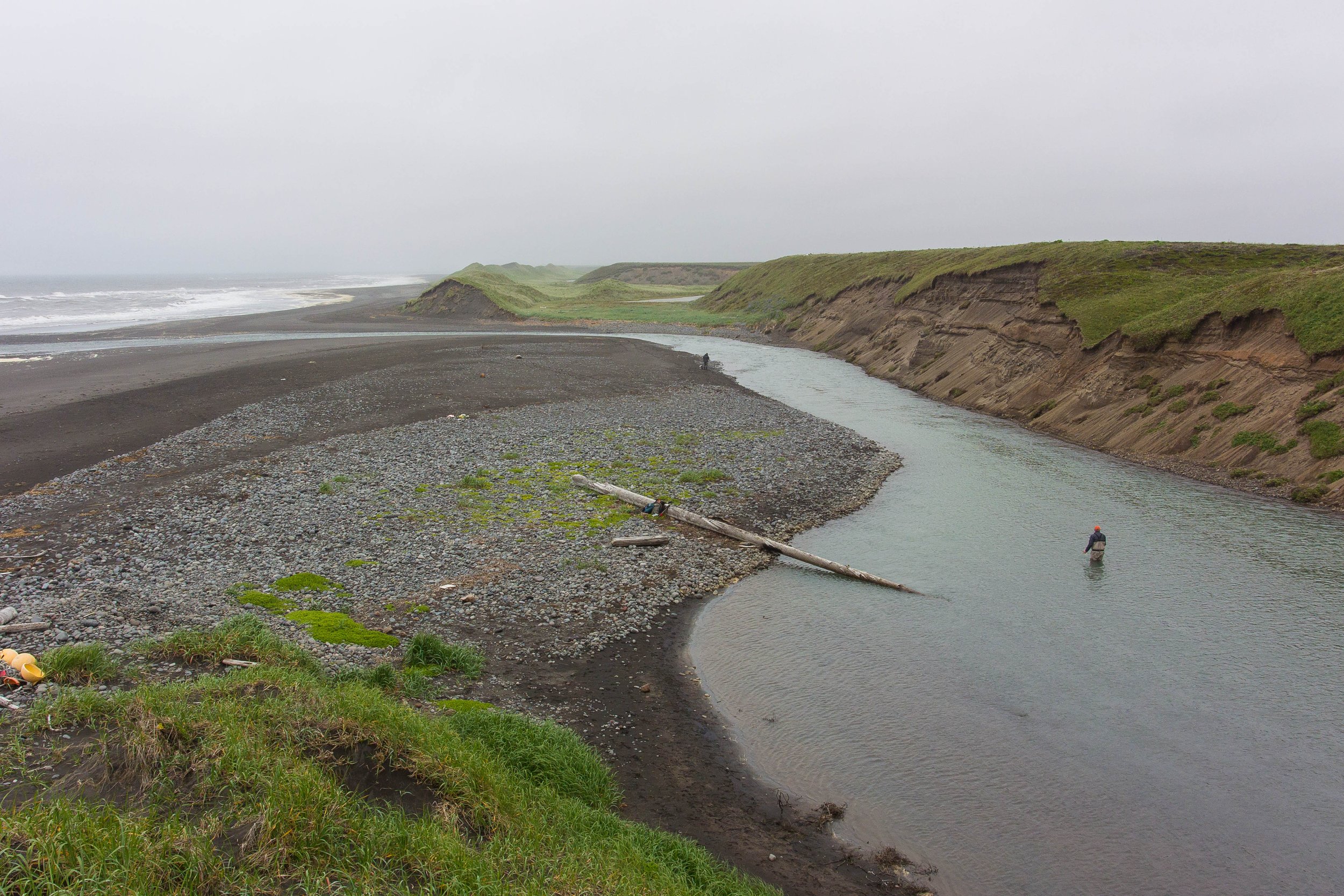 A typical North Creek trip includes two days of fishing and one night at our comfortable camp, located just off the black sand beach. The camp features clean cabins with cots, sleeping bags, and electricity for lights. Meals are simple and hearty, prepared by our lodge chef, and when conditions allow, there’s nothing better than fresh fish cooked over an open fire for lunch.